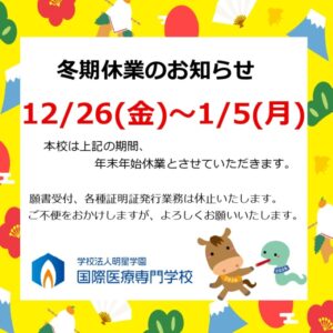 本校は下記の期間を年末年始休業とさせていただきますのでご了承ください。
