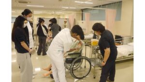 実際の注射器を手に、車椅子に座った実習用モデルさん(人形)へ慎重にアプローチします。